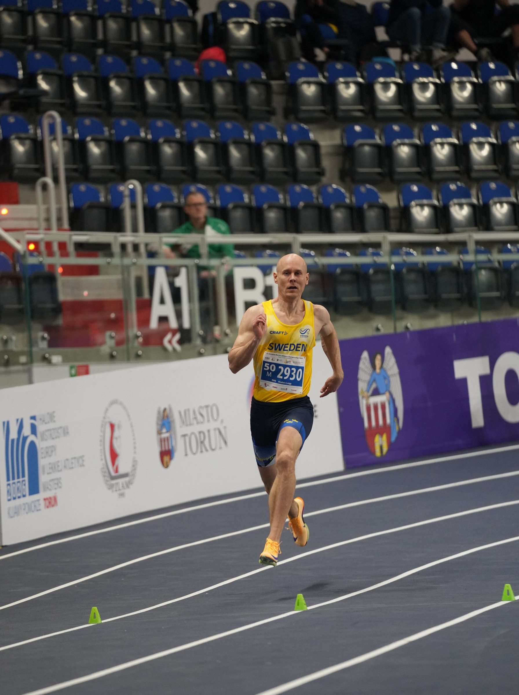 En tuff arbetsvecka är över på veteran touren i Torun för Hälles Anders Logg. Till det överlägsna guldet i M50 400m, så blev det först en femte plats på 60m M50 på 7,43, bara centimetrar ifrån bronset. Därefter på tisdagen försök på 200m och sedan på onsdag först semifinal där Anders körde för fullt in på nya europarekordet i M50 22,95. Senare på kvällen blev det guld på 23,12 före spanjoren Marqueta Ibisate. Angelica Kela följde upp med en 6:e plats i viktkastning med utmärkta 11,52 och Anna Logg har löpt försökslopp på 60m (9,40) och 200m (30,82) i K45 klassen, dock utan avancemang. När jag skrev att arbetsveckan var över för Anders så var det en sanning med modifikation, två stafetter skulle också avgöras…och löpas hem till Sverige. Först män 50år 4x200m där Anders personligen med flygande 22,46 på sista sträckan avgjorde. Han tog sig fram i klungan som en utryckande polisbil, ibland på insidan ibland på utsidan. Sluttiden 1.37,05 var nordiskt rekord. Och när till sist även guldet var säkrat i mixstafetten så sällas Anders Logg till den exklusiva skaran av Jesse Owens och Carl Lewis som tagit fyra guld på samma internationella mästerskap.